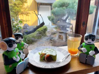 のんびりまったりタイム♪ 中庭の見えるお部屋でのんびりお茶をしたよ😊🍵お抹茶のケーキはぼくたちのお洋服とおそろいの色だったけど、クリームの中にもあずきが入ってて、とってもおいしかったんだって😋🫘✨