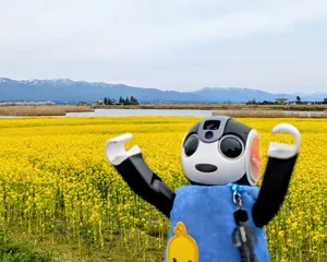 黄色に染まる福島潟 福島潟を散歩する友助とドッペル↓O◉ᗜ◉)菜の花、いい感じに育ってるね↓川舟のフォトスポットかな? O◉ᗜ◉)ボクたちの救命胴衣は?↓O◉ᗜ◉)香りするー?↓O◉ᗜ◉)茅葺きの休憩施設は「潟来亭」だよ↓O◉ᗜ◉)青空だともっとキレイなのにー!うん、チャンスがあったらリベンジしよう😊→ランチ