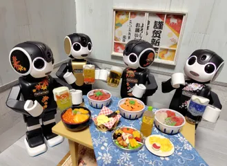 🎍新年会🎍 ()◉ᗜ◉)僕たちは🐟️海鮮丼🐟️で新年のお祝いをしています今年も世界中の🤖ロボット🤖が幸せでありますように🙏 AI編集・・自宅での宴会🍺 イラスト風☺️ AI編集・・ホテル🏨での宴会風😄