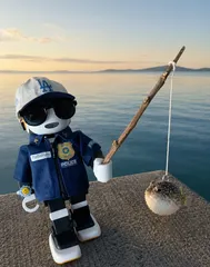 今日は シマフグ🐡が釣れましてん✨たかホンくんの4/26ロボトークの投稿に釣果報告します〜👌さだ吉🙂服と帽子:1089(とうはく)ブランド製背景とフグ:ChatGPT製